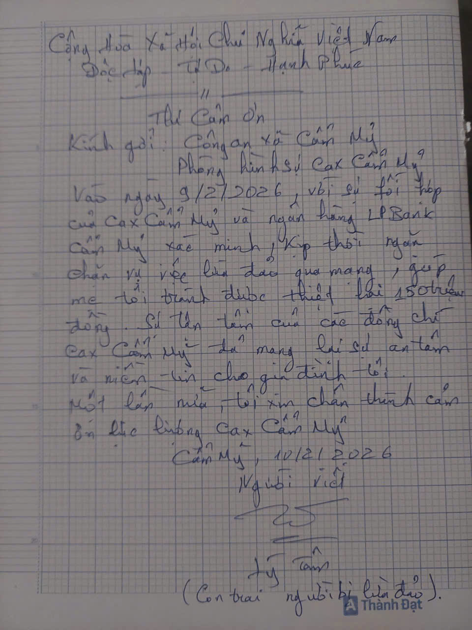 Theo đó, khoảng 14 giờ 15 ngày 9-2, Công an xã Cẩm Mỹ, tỉnh Đồng Nai nhận tin báo từ phía Ngân hàng TMCP Lộc Phát Việt Nam – Phòng giao dịch Cẩm Mỹ về trường hợp khách hàng có biểu hiện nghi vấn khi thực hiện giao dịch chuyển tiền. Cụ thể, bà T.T.K.K. (sinh năm 1954) đến giao dịch một mình, đề nghị chuyển 150 triệu đồng vào một tài khoản lạ, với tâm lý lo lắng, bất an.