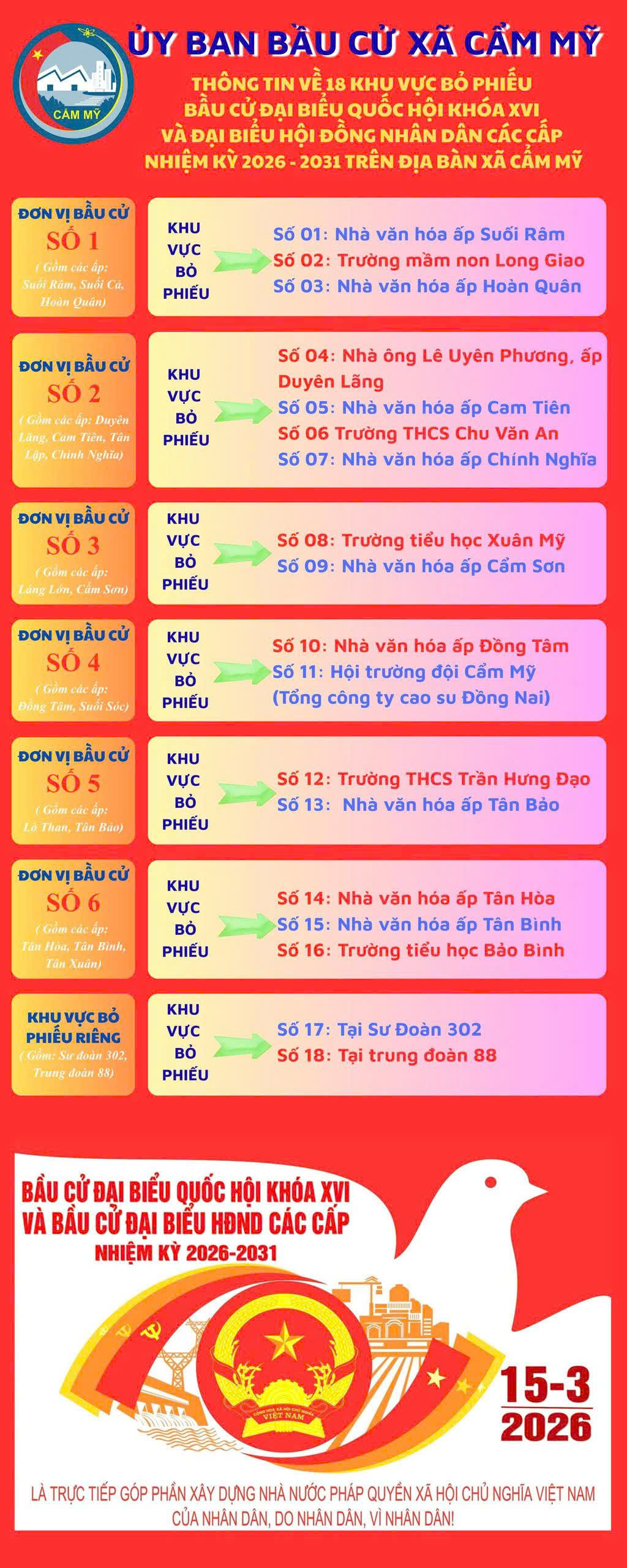 Thực hiện Luật Bầu cử đại biểu Quốc hội và đại biểu Hội đồng nhân dân; căn cứ các văn bản chỉ đạo của Quốc hội, Chính phủ, UBND tỉnh Đồng Nai và Ủy ban bầu cử xã Cẩm Mỹ, Ủy ban nhân dân xã Cẩm Mỹ đã ban hành Quyết định số 43/QĐ-UBND về việc xác định 18 khu vực bỏ phiếu phục vụ cuộc bầu cử đại biểu Quốc hội khóa XVI và đại biểu HĐND các cấp, nhiệm kỳ 2026 – 2031 trên địa bàn xã.