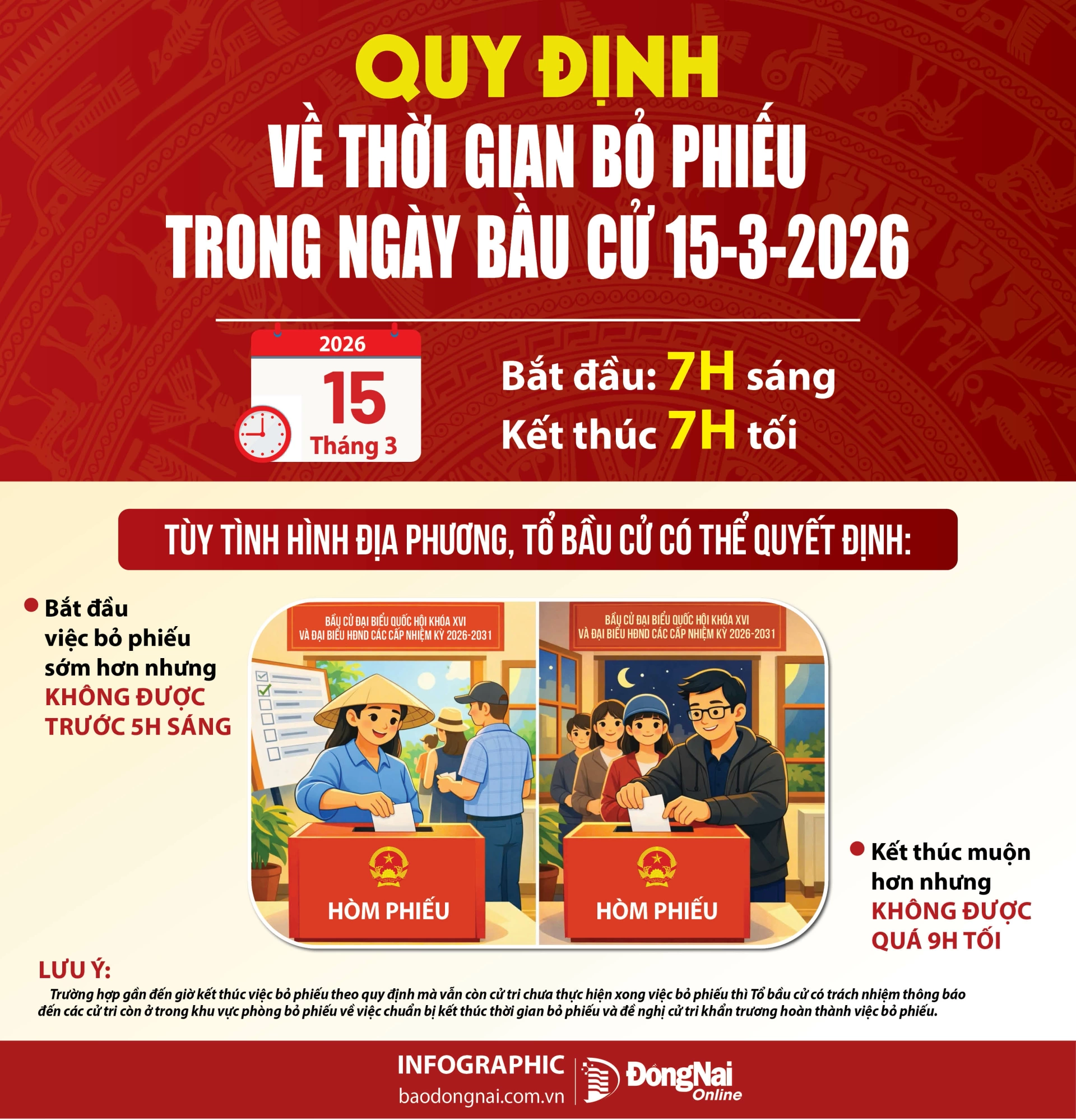 Theo Hội đồng Bầu cử quốc gia, trong ngày bầu cử, việc bỏ phiếu sẽ được bắt đầu từ 7h sáng và thực hiện liên tục cho đến 7h tối cùng ngày. Tùy tình hình địa phương, Tổ bầu cử có thể quyết định cho bắt đầu việc bỏ phiếu sớm hơn nhưng không được trước 5h sáng hoặc kết thúc muộn hơn nhưng không được quá 9h tối cùng ngày.