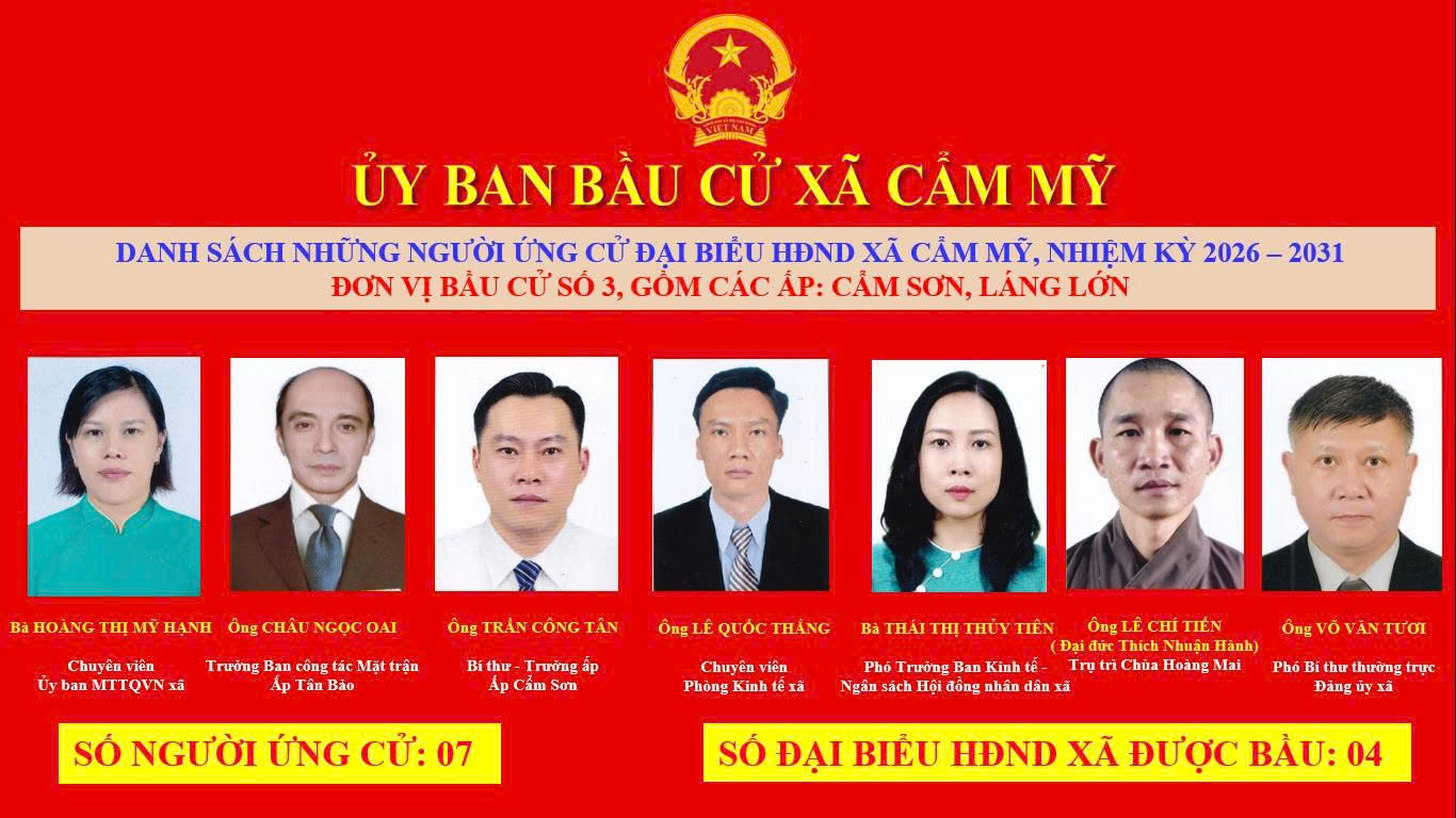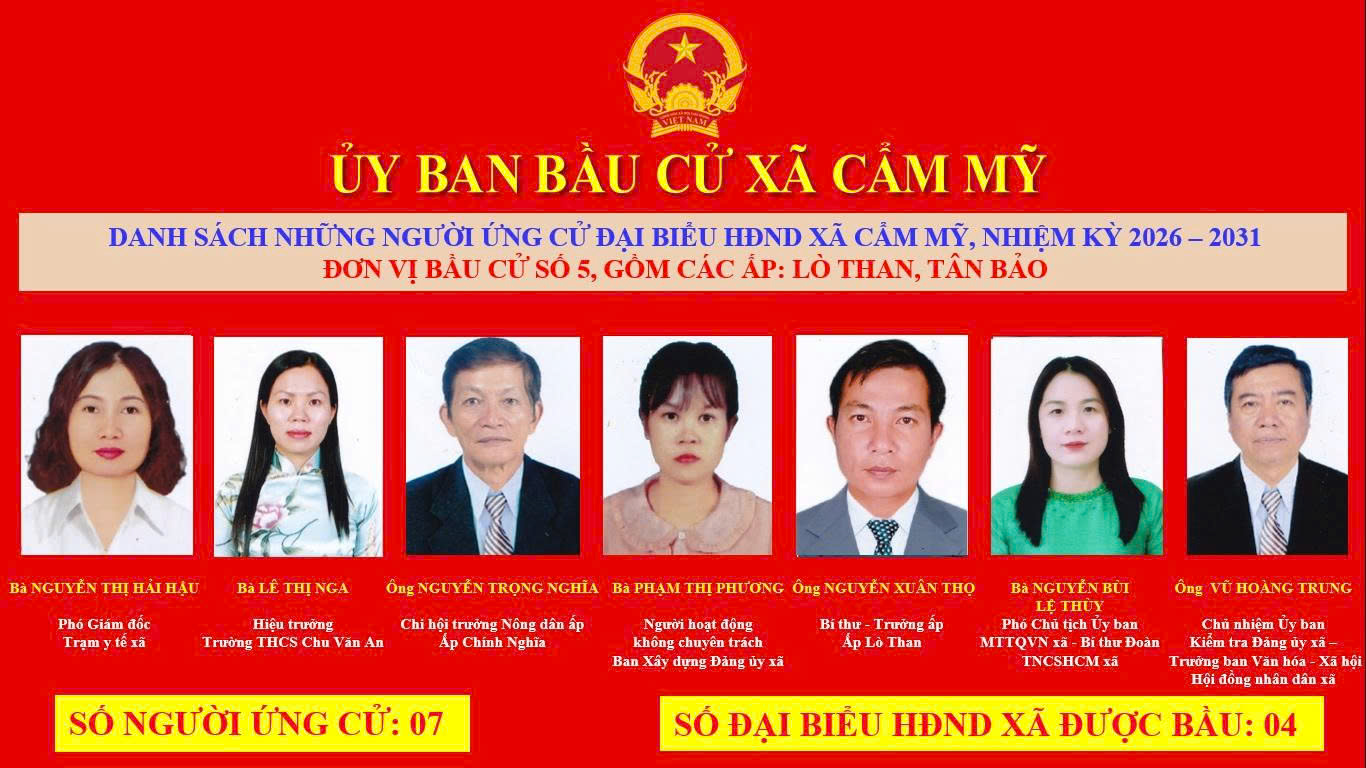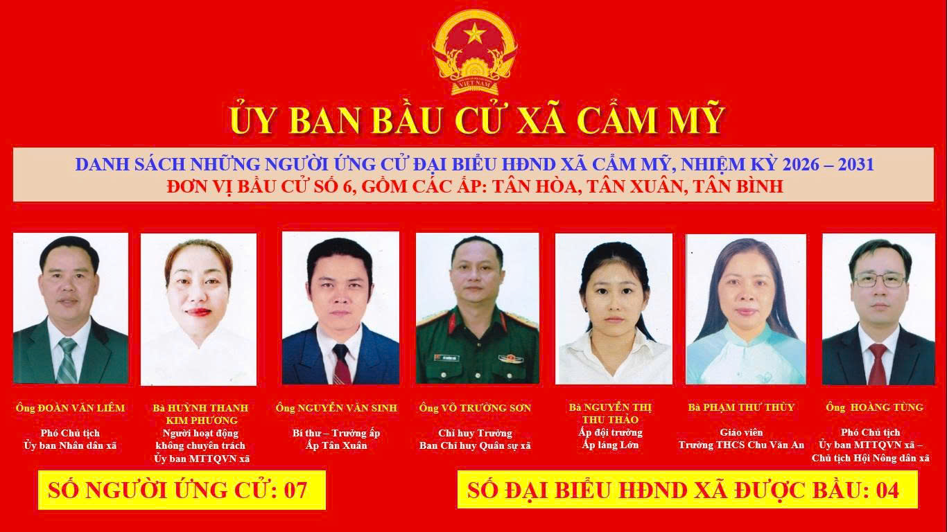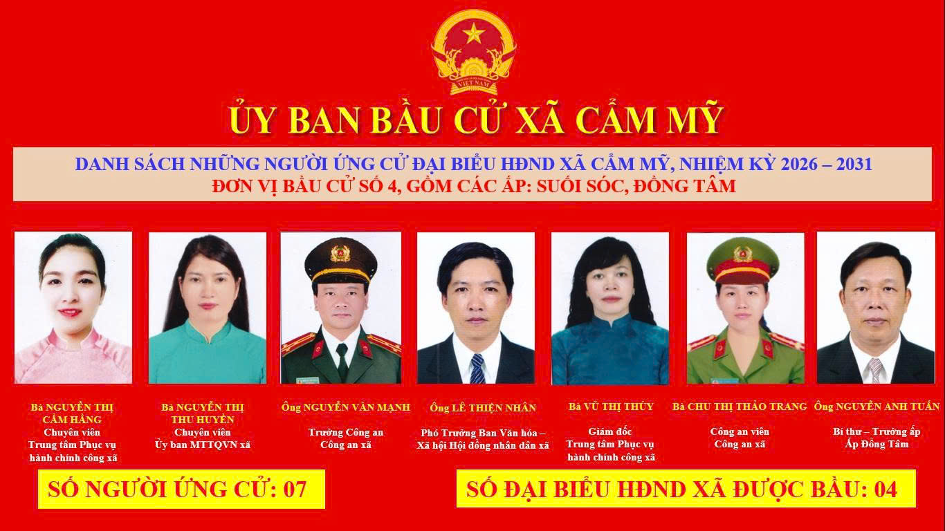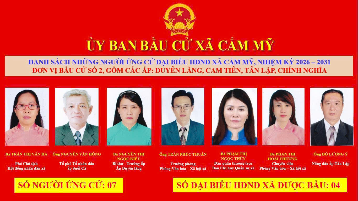 Ủy ban bầu cử xã Cẩm Mỹ vừa ban hành Nghị quyết số 35/NQ-UBBC ngày 25 tháng 2 năm 2026 về việc công bố danh sách chính thức những người ứng cử đại biểu Hội đồng nhân dân xã Khóa II, nhiệm kỳ 2026-2031 theo đơn vị bầu cử của xã Cẩm Mỹ.